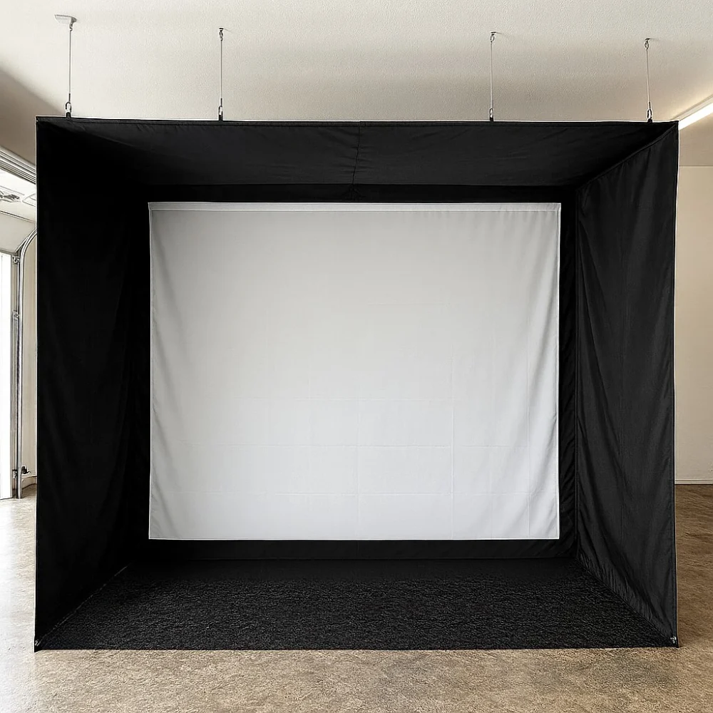 The LZ Roll-Up Golf Simulator Bay is a ceiling-mounted enclosure designed to give you a full golf simulator without permanently taking over your space. It hangs from the ceiling and rolls up neatly when not in use, making it ideal for garage setups and multi-use rooms. When deployed, it provides a safe, enclosed hitting area for practice and simulator play. This system is one of the most popular choices for golfers who need flexibility without sacrificing functionality. Set it up when you want to play, roll it away when you’re done.